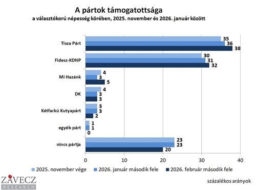 Továbbra is hatékony a két nagy párt szavazatbővítő kampánya: az elmúlt hónapban a Tisza Párt támogatottsága a teljes választókorú népességen belül 36-ról 38%-ra, a Fidesz-KDNP 31-ről 32%-ra emelkedett, derül ki a Závecz Research 2026. február 22-28. között készült közvélemény-kutatásából. Közleményük szerint a Tisza tábora így már meghaladja a 3 millió főt, a Fideszé a 2,5 millió főt.