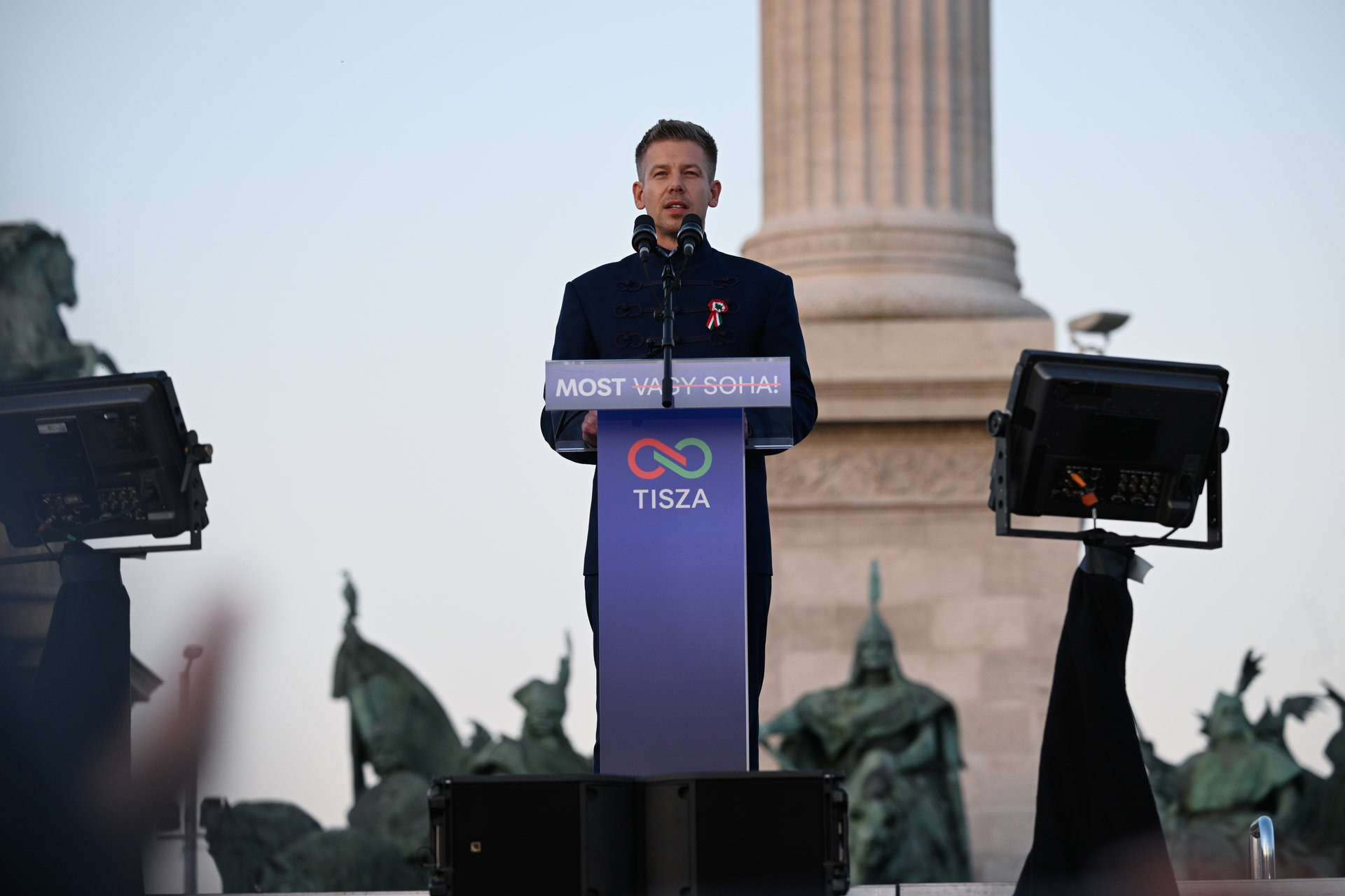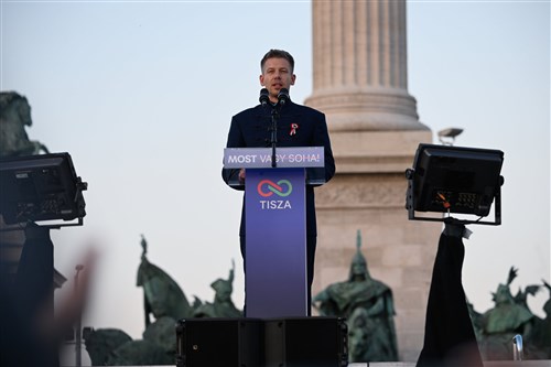 A Tisza Párt elnöke szerint az emberek már tudják, hogy változás kell, hogy a jövő itt kopogtat az ajtón, ahogy 1848-ban, most is a kezünkbe vehetjük a sorsunkat. – 2026 április 12-e a magyar nemzet felemelkedésének kezdete lesz – fűzte hozzá. Akkor is ha Orbán Viktor a hazánkba hívta a legképzettebb orosz ügynököket, hogy ne érvényesülhessen a magyarok akarta, „hazugság, megtévesztés és hergelés, ezt szánják nekünk”. – Orbán Viktor elárulta a magyar szabadságot, még pedig harminc ezüstért magának és a dinasztiának. Szégyen – mondta, hozzátéve, hogy a magyar nép ezt nem tűri, mert sohasem tűrte, hogy elvegyék a szabadságát. Április 12-én ezért – folytatta – olyan győzelmet aratunk, hogy nemcsak a Holdról, de a Kremlből is látszik majd. Árulónak nevezte a miniszterelnököt azért is, mert elárulta a közös jövőnket, megosztotta a nemzetet és háborúval provokál, háborúval fenyeget, ez az utolsó fegyvere, amivel hatalomban akar maradni. Itt kiemelte, hogy „mi magyarok nem akarunk háborút”, ezt skandáltatta a tömeggel is. A Tisza a béke kormánya lesz – folytatta –, Orbán Viktornak pedig mennie kell és menni fog.