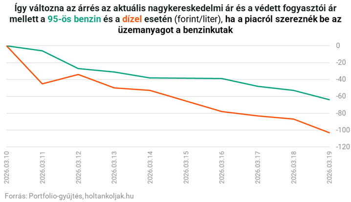 A védett árakhoz képest a különbség tehát még tovább nő; a 95-ös benzin piaci ára mától 64 forinttal magasabb, mint az 595 forintos benzin védett ára, a gázolaj piaci ára pedig jelenleg 103 forinttal magasabb, mint a 615 forintos gázolaj védett ára.