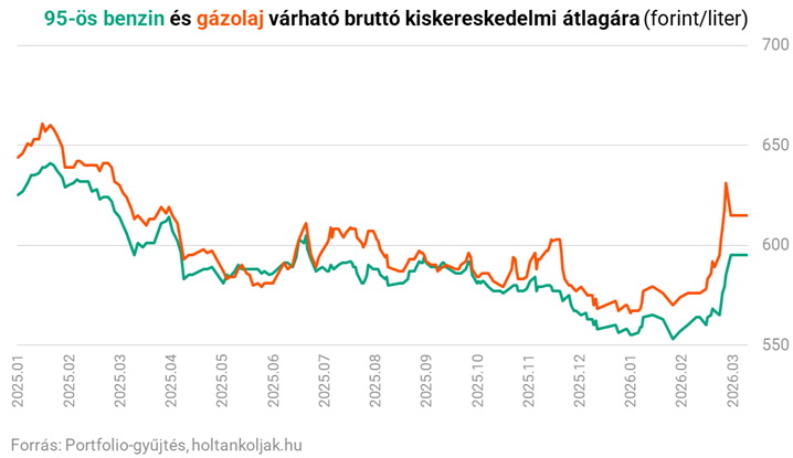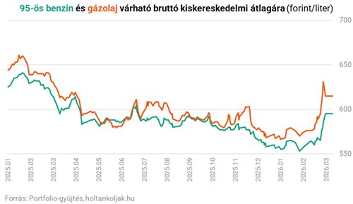 A piaci átlagárak az alábbiak szerint alakulhatnak ma: 95-ös benzin: 659 Ft/liter, gázolaj: 718 Ft/liter.