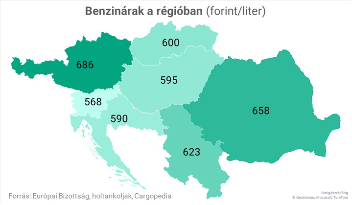 A hétfői adatok alapján bőven nyugodtak lehetünk, hiszen ebben a közegben a benzin esetében 22 forinttal volt olcsóbb a hazai piac az átlagnál,