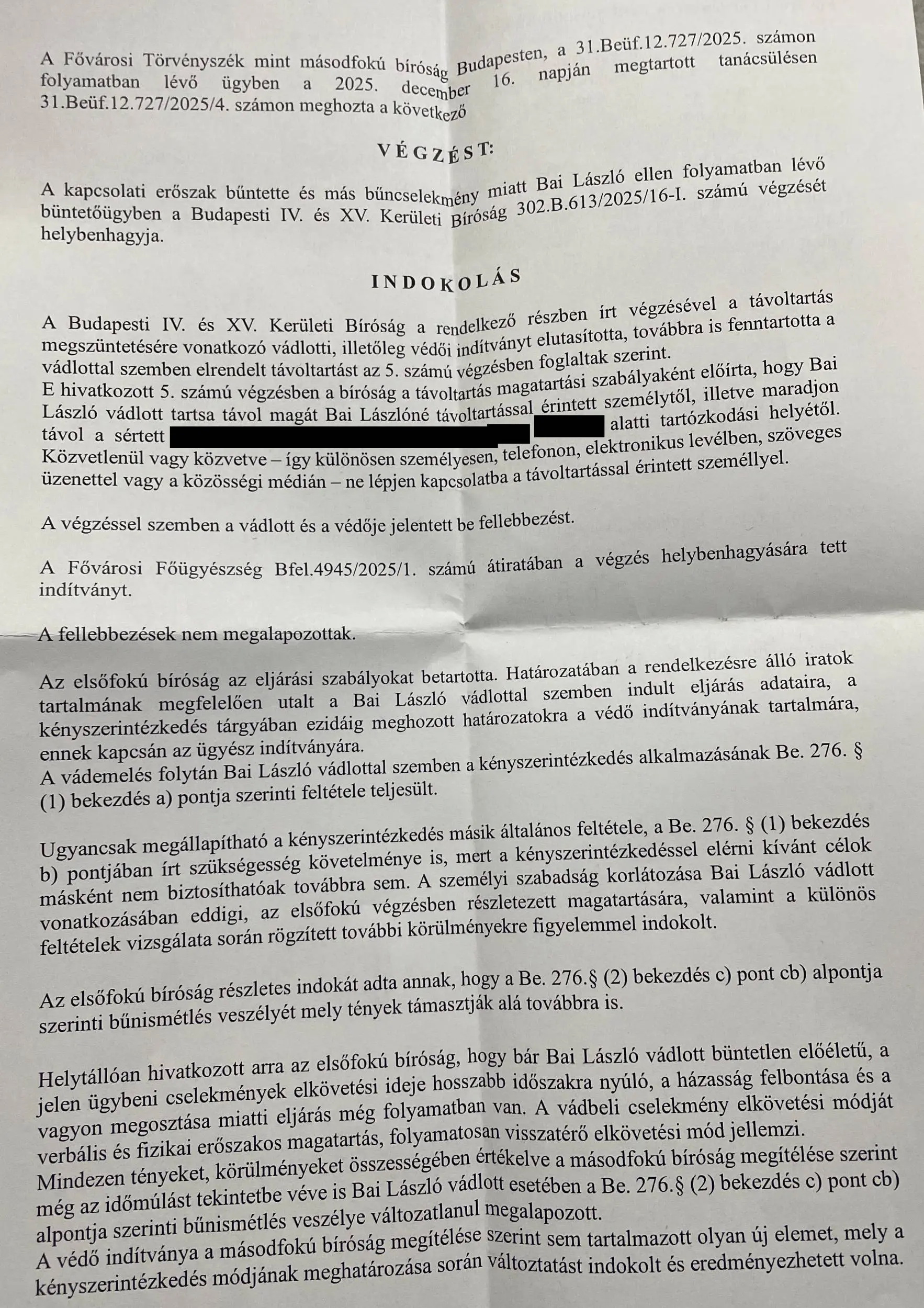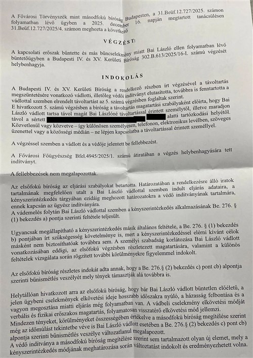 A rendőrségi nyomozás lezárulta után az elsőfokú bíróság – a büntetőügy megindítása mellett, ami jelenleg is folyamatban van – távoltartási végzést rendelt el Bai Lászlóval szemben, amit a másodfokon eljáró Fővárosi Törvényszék 2025. december 16-án meghozott végzése fenntartott.