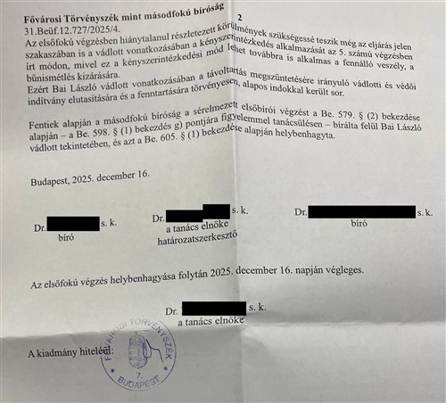 A Fővárosi Törvényszék végzése