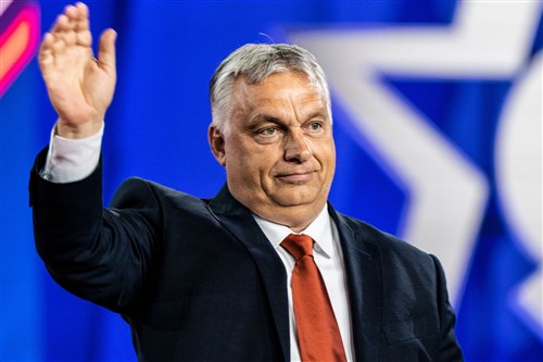 Orbán búcsút int - kérdés, hogy a saját a híveinek vagy a könnyen leszedésre sem méltatott Messiás Péternek (fotó: IPA / Fotogramma)