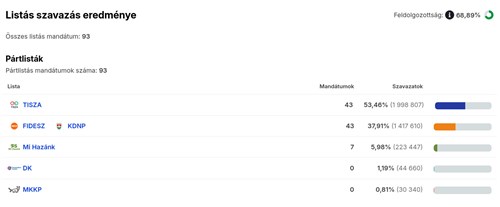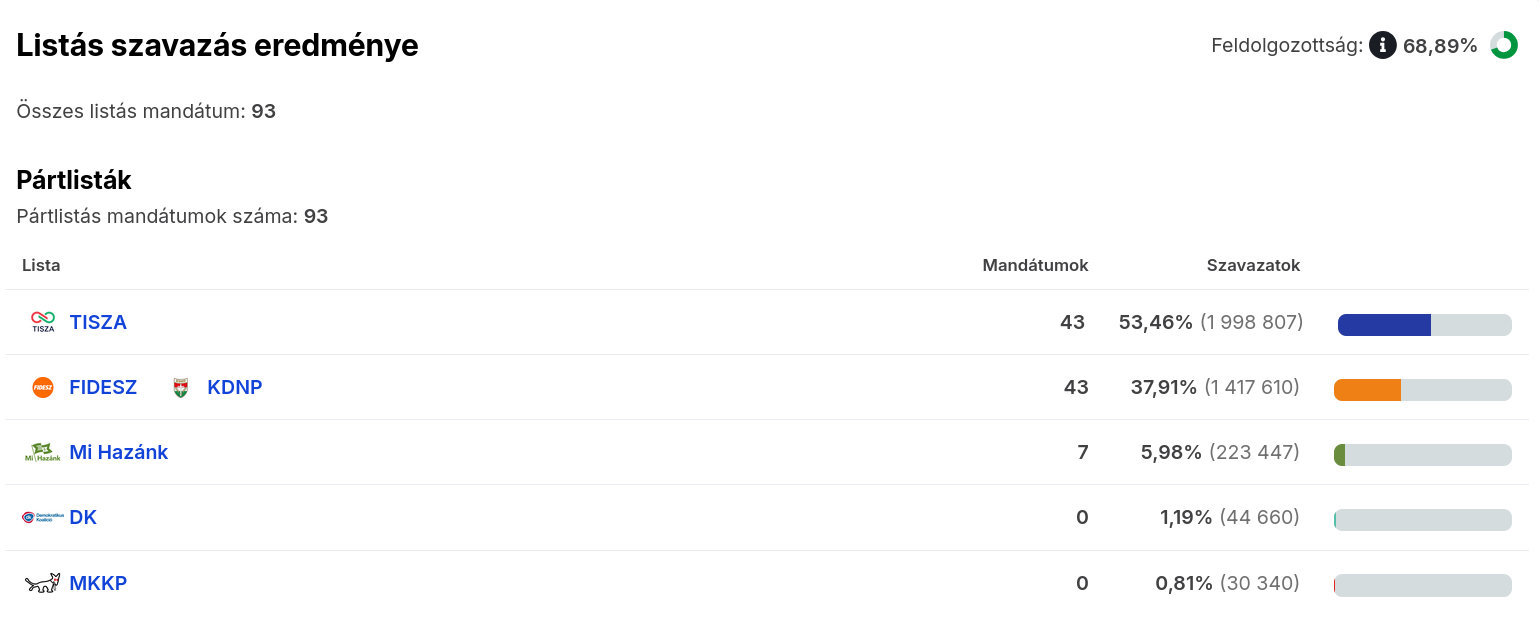 Egyre valószínűbb, hogy a Tiszának megvan a kétharmad, jelen állás szerint 95 egyéni körzetet nyertek, ami 42 listás mandátummal egészül ki. Ez természetesen még módosulhat, de ahogy nő a feldolgozottság, úgy válik egyre biztosabbá az eredmény.