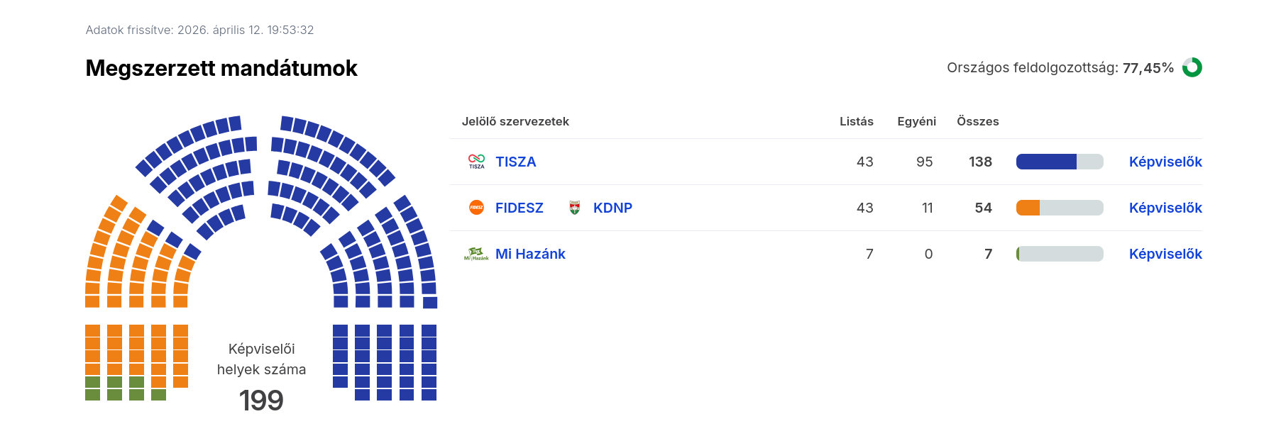 Az ábrák közötti feldolgozottság eltérő, illetve az egyéni képviselőknél való állás is számít, ezért ellentmondhatnak egymásnak. A nemzetiségi listák közül a cigányoké később érdekes lehet, de az ő mandátumukkal majd akkor számolnak, ha összeszámoltak kellő érvényes szavazatot.