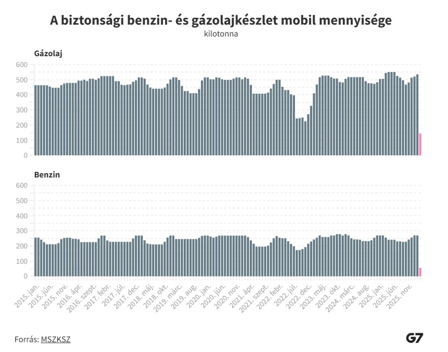Igazán jelentős változás azonban nem az olaj, hanem a feldolgozott termékek esetében volt. A kormány az iráni háború kirobbanása után ugyanis a teljes gázolaj- és benzintartalékot felszabadította. Erre elsősorban a védett ár bevezetése miatt volt szükség, hiszen az alacsony kiskereskedelmi árak miatt leállt az import, így hetek óta több benzint és gázolajat használunk fel, mint az előállított és behozott mennyiség összege.