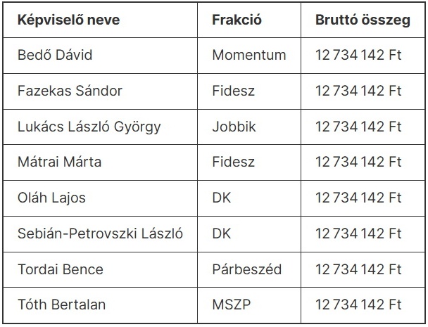 A legkevesebb pénzt azok kapják, akiknek semmilyen parlamenti, bizottsági vagy frakciótisztségük nincs, és csak a képviselői alapilletmény jár nekik. Ők bruttó 6,37 millió forinttal búcsúzhatnak a parlamenttől. Köztük van például Navracsics Tibor, Nagy István, Tuzson Bence, Vitályos Eszter, Koncz Zsófia és Hadházy Ákos. Utóbbi képviselő ráadásul Kövér László büntetése miatt hónapok óta a tiszteletdíja töredékét, bruttó 322 800 forintot kapja csak meg.