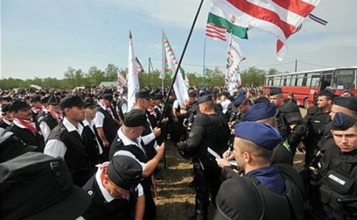 A Skanzen közelében egy kerítéssel körbezárt magánterületen mintegy félezer, fehér inget, fekete nadrágot és mellényt, a bíróság által jogerősen feloszlatott Magyar Gárda egyenruháját viselő ember sorakozott fel alakzatban, Árpád-sávos és jobbikos zászlót lobogtatva, és esküt tett az előre meghirdetett időponttól öt órával hamarabb.
