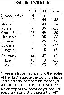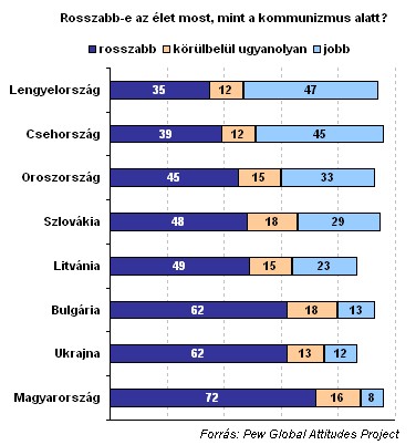 Húsz évvel a berlini fal és a vasfüggöny leomlása után visszatekintve a volt kommunista országok lakosságának többsége támogatja a szabad piac és a többpárti demokrácia megjelenését, azonban ez a lelkesedés nem egyformán jellemző a kelet-közép európai országokra. A magyarok 77%-a nem hisz a jelenlegi politikai rendszerben, 91% szerint az ország rossz úton halad, összességében a régió messze legpesszimistábbjai a magyarok, mindössze 15% mondja azt, hogy elégedett a személyes életével - derül ki a Pew Global Attitudes Project legfrissebb felméréséből.