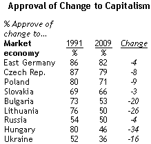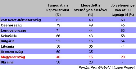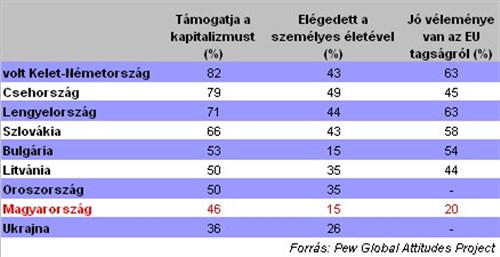 Az 1991-ben készült felmérés szerint még a magyarok több mint háromnegyede örült a kapitalizmus és a demokrácia beköszöntének, mostanra már csak a lakosság fele lelkes ezen intézményekért. A volt kommunista országok közül csak olyanok pesszimistábbak, mint Bulgária, Ukrajna és Oroszország. A volt kelet-német lakosság és a csehek maradtak a leglelkesebbek.