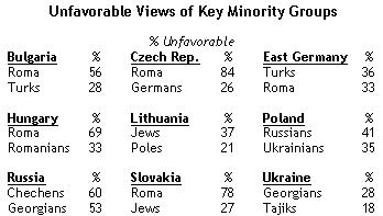 Nos, Magyarország esetében a legellenszenvesebbek a cigányok (69%), a románok (33%), a zsidók (29%) (talán épp ezért publikálták csak az első két adatot) és az ún. szlovákok (27%) (de ez feltehetően még a nyelvtörvény előtti állapotot tükrözi).