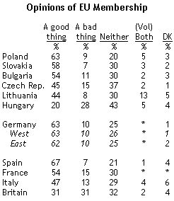 Az EU-tagság megítélése is nagyon változó a tagországokban. Válaszuk szerint inkább jónak érzik a spanyolok, lengyelek és felvidéki tótok (és az ott élő magyarok) többsége, míg a magyarok közül csak 20% mondja ugyanezt.