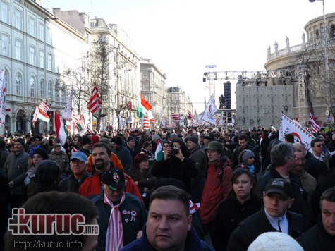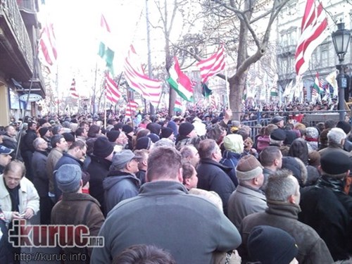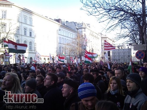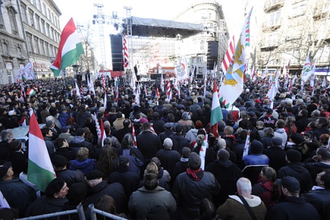 16.14: A Jobbik gyűlése ifjabb Hegedűs Loránt beszédével folytatódott (mely itt olvasható), majd elhangzott Petőfi Sándor A nép nevében című verse. Ezt követően Szegedi Csanád, a Jobbik másik európai parlamenti képviselője kezdte el beszédét, legelőször nagy tapsot kért a gárdistáknak. Majd arról beszélt, közel a választás, amit annyira vártak, hogy igazságot tehessenek. Sokan azt gondoltuk, hogy lehet előrehozott választás - tette hozzá. Az elmúlt húsz év azzal telt, hogy meggyaláztak minket minden nap - mondta 15 millió magyar nevében a politikus, aki szerint az elmúlt 65 évről fogunk döntést hozni április 11-én. Videó itt.