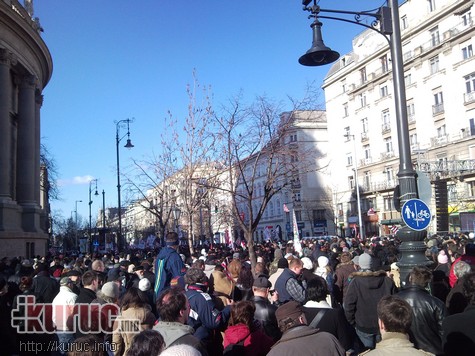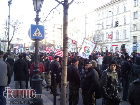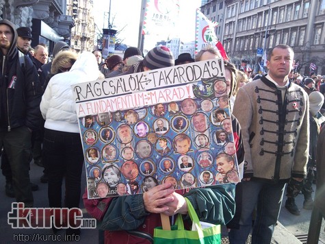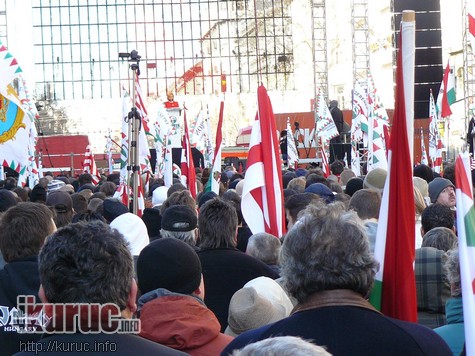 Mikor Morvai szabadságot követelt a politikai foglyoknak, a tömeg Budaházy György nevét kezdte skandálni, a 12 pont végén zengett a "Vesszen Trianon".