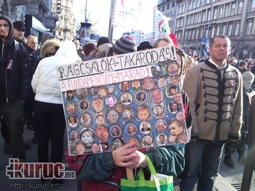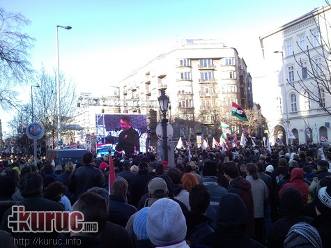 15:30: A Fidesz rendezvénynek már az elején azzal vannak elfoglalva, hogy próbálják lebeszélni ingadozó híveikat a Jobbikra való szavazásról. Kósa arról értekezett: a "szélsőségesek" csak rombolni tudnak, építeni nem. A tévészékházra utalva így fogalmazott: "Az egyik szélsőség elkótyavetyéli, a másik felgyújtja, de egyik sem építi. Építeni csak törvényes rend útján lehet."