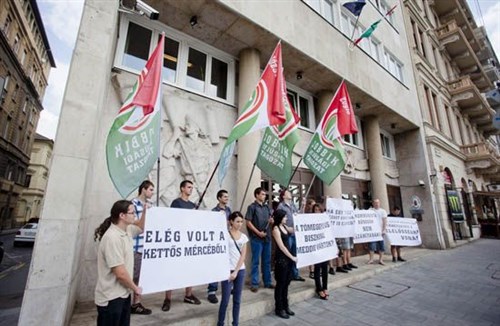 A kettős mércére hívta fel a figyelmet a sajtótájékoztatón ott lévő Jobbik Ifjúsági Tagozata is transzparenseikkel: