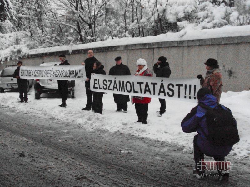 A Jobbik Veszprémi Alapszervezete a rossz idő ellenére már a meghirdetett időpont előtt egy órával felsorakozott a fogadására. Ekkor tudtuk meg hogy a "libás celeb" már megérkezett, tehát csak a fórumra érkezőket tudjuk fogadni. De mi kitartottunk, s megérte. Nem minden nap láthat az egyszerű ember a középső ujját a magasba emelve rázó, láthatóan több százezer forintos bundát viselő "dámát", békésen demonstrálókat torka szakadtából nácizni.
