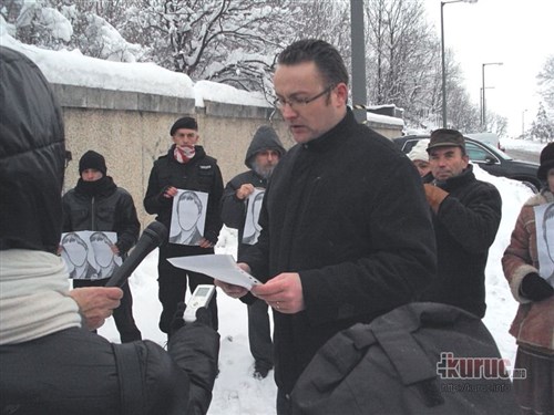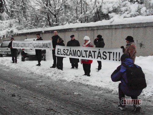 De nem ez volt az egyetlen olyan esemény ami meglepett. Az egyik képen jól látható, eddig szinte minden rendezvényünkön ugyanebben az öltözetben megjelenő társunkkal szemben a rendőrség most intézkedett. Eddig soha. Elvezetéssel és elzárással való fenyegetés kíséretében levetették vele a fejéről a barettet és a csíkos sálját, mondván, hogy a betiltott Magyar Gárda egyenruháját viseli. Vajon miért változott meg a rendőrök hozzáállása ilyen mértékben? És miért csak a rendezvény második felében, Kovács Rajmund alapszervezeti elnök sajtótájékoztatóját követően, amikor már az újságírók elhagyták a rendezvényünk helyszínét, s bementek a "libás celeb" fórumára? Az intézkedés diszkrét bája, hogy egy Árpád-sávos címert viselő rendőr távolíttat el egy Árpád-sávos sálat társunk nyakából a hófúvásban.