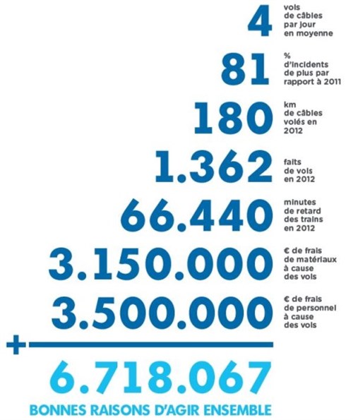 Belgiumban 2009-2012 között négyszeresére nőtt a kábellopások száma, tavaly 180 km-nyit vittek el. Tele is plakátolta a vasút az állomásokat a linken látható poszterrel.