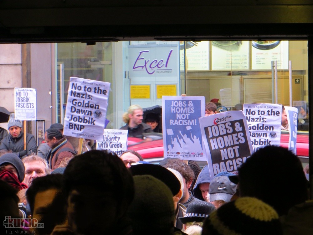 Negyed egy tájékán érkeztünk a Holborn metróállomáshoz, ahol az állomás előtti járdán kb. 70-80 fős, elég vegyes összetételű, mindenféle táblákat tartogató csoport hangoskodott. Először igazán azt sem lehetett érteni, hogy mit és kik kiabálnak, de éppen akkor előkerült egy nagyhangú, kézi hangosbeszélőt maga előtt tartó férfi, aki aztán skandálni kezdte a többieknek a "mondanivalót". Ez olyasmikből állt, hogy "nácik haza", "6 millió halott", "Auschwitz". Nagy rendőrségi készültséget lehetett látni a környéken, jópár tucat rendőrrel, rendőrségi járművekkel egyetemben.
