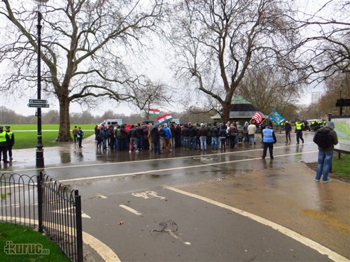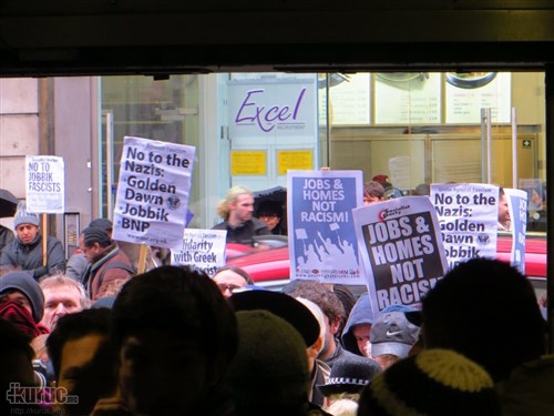 Onnan kb. fél óra múlva visszaérkezve már néhány tucatnyira duzzadt az érkezők száma, közben kissé nőtt az "antifasiszta" ordítozók száma is. A rendőrök ekkor 1-2 perc alatt fémkordont állítottak fel az ordítozók, illetve a gyülekezők között, elválasztva egymástól a két csoportot. A metróállomásnak két irányban van kijárata, a hangoskodók a nagyobb, szélesebbik, míg a gyülekezők ekkorra inkább az oldalsó, kisebbik kijárat előtt csoportosultak. 5-10 perc elteltével a rendőrök megkérdezték a mi csoportosulásunk kisebb csoportjaitól, ki jött a gyűlésre, ki a magyar, majd a saját "biztonságunk érdekében" udvariasan megkértek minket, hogy az oldalsó kijárat még épületben lévő részébe húzódjunk vissza. Az ekkorra már kb. 150-200 főre duzzadt csoportunk ezt meg is tette, a rendőrök pedig azonnal kordont húztak e kijárat elé is, ahova közben áthúzódtak az "ellenünk" hangoskodók is. A rendőrök az állomáson belül, mögöttünk is lezárták ezt a szektort, de maximálisan udvariasak voltak, semmiféle ellenünk irányuló gesztust nem tettek. A kinti "tüntetők" közül néha magyarul is kiabáltak nekünk, egy olyat is elkaptam pl. hogy "szarháziak haza!". Gondolom, ő egy Angliában tartózkodó, de éppen ügyeletben nem lévő magyar agysebész lehetett...
