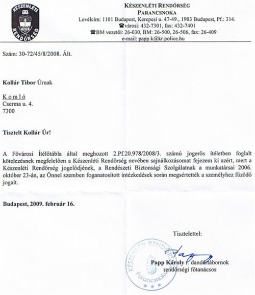 A jogerős ítéletben a pénzbeli marasztalás mellett bocsánatkérésre is kötelezték, mind az elsőrendű BRFK-t, mind a másodrendű Készenléti Rendőrséget (lánykori neve: REBISZ).