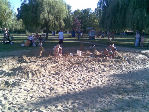 A képen látható ifjú hazafiak (szülői segítséggel megtámogatva) a Nagy-Magyarország sziluettjébe ágyazva építették a homokvárakat, nemzeti zászlókkal díszítve, a keszthelyi Helikon strandon. Minden napos program a strandi homokvárépítés, de most először kerültek a megfelelő helyre végváraink. Közben Gömbös Tamás történész hallgató barátunk pallérozta a kicsik elméjét, óvatosan elültetve kis buksijukban a megfelelő "magot".