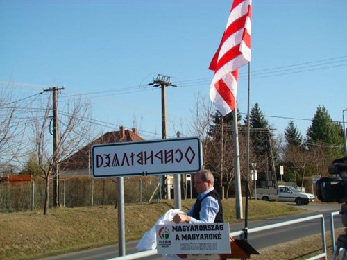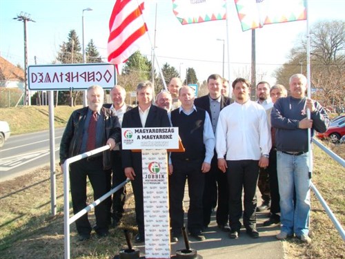 A Jobbik Kozármislenyi Szervezetének szervezésében avatták fel a Pécs melletti település rovásírásos helységnévtábláját szombaton.