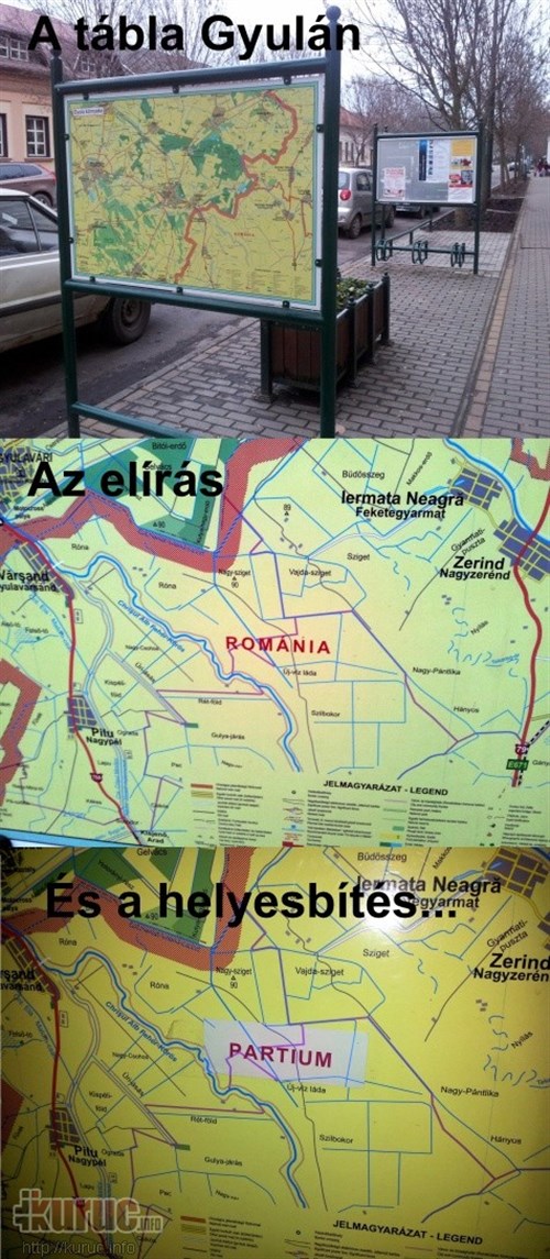 Valakinek feltűnt, hogy Gyulán, a Kossuth utcán egy turistainformációs táblán a megszálló oláhok szája íze szerint feliratozták a térképet: a történelmi Partiumot helytelenül Romániának írták... Emberünk nem volt rest, és saját maga eszközölt helyesbítést az ügyben:
