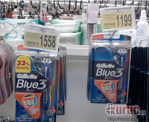 Nemrég lőttem a képet az Auchanban, szuper akció multi módra. 33% gratis, ezért csak kb. 30%-kal drágább, mint a normál árú termék... (Mindkettőben 6 darab penge van, az akciós ahelyett, hogy 33%-kal olcsóbb lenne, épp ennyivel drágább.)
