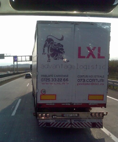 Az első képen egy 2006-ban alapított bukaresti székhelyű, román szállítmányozó cég kamionjának hátulja látható.
