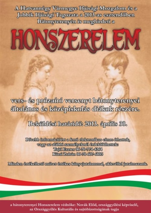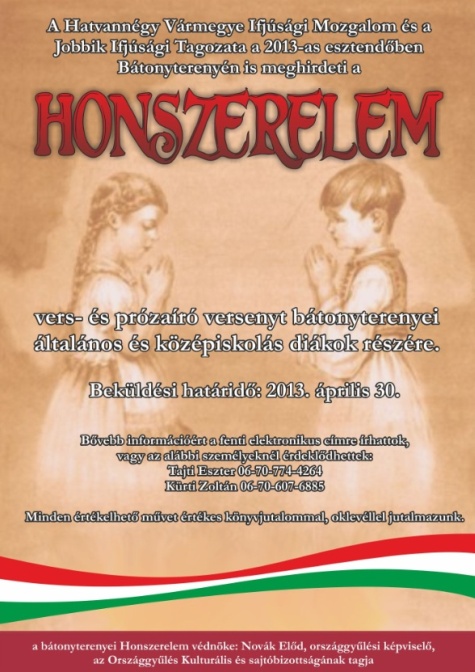 A Hatvannégy Vármegye Ifjúsági Mozgalom és a Jobbik Ifjúsági Tagozata a 2013-as esztendőben Bátonyterenyén is meghirdeti a Honszerelem vers- és prózaíró versenyt elsősorban bátonyterenyei általános és középiskolás diákok részére, de mindenkitől szívesen fogadnak beküldött írásokat.