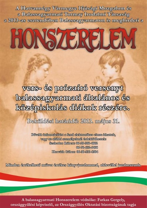 A Hatvannégy Vármegye Ifjúsági Mozgalom és a Jobbik Ifjúsági Tagozata a 2013-as esztendőben Balassagyarmaton is meghirdeti a Honszerelem vers- és prózaíró versenyt, elsősorban balassagyarmati általános és középiskolás diákok részére, de mindenkitől szívesen fogadnak beküldött írásokat.
