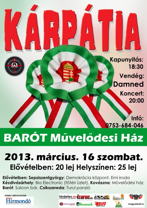 A helyszínnel ellentétben az időpontok nem változnak, tehát március 16-án a baróti művelődési házban 18:30-kor kapunyitás, 19:00 órakor lép színpadra a Damned zenekar, 20:00 órakor pedig a Kárpátia csap a húrok közé. Elővételben még 150 jegy áll az érdeklődők részére, amelyeket megvásárolhatnak a sepsiszentgyörgyi demokrácia-központban és az új helyszínen, a baróti művelődési házban, amíg a készlet tart! Bővebb információk a jegyvásárlással, illetve visszaigénylésekkel kapcsolatosan a következő telefonszámon: 0753-684-046.