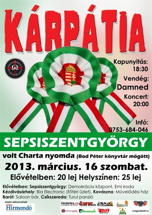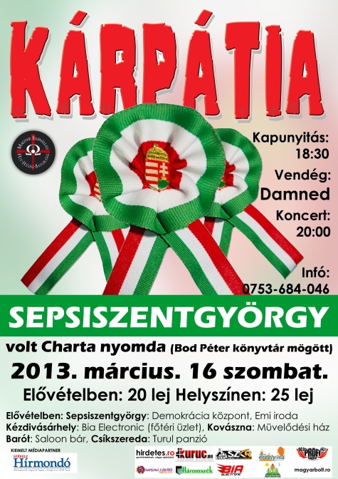 Korábban írtuk: Nemzeti ünnepünk alkalmából Kárpátia-koncertet szervez a Hatvannégy Vármegye Ifjúsági Mozgalom (HVIM) kézdivásárhelyi tagszervezete március 16-án, szombaton. Előzenekarként fellép a Damned Gyergyószentmiklósról. Az új helyszín a volt Charta nyomda (a Bod Péter könyvtár mögött).