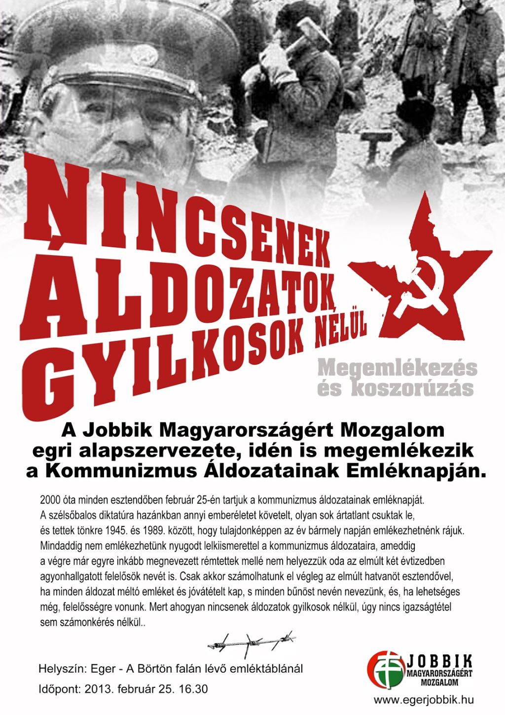 A Jobbik Magyarországért Mozgalom egri alapszervezete idén is megemlékezik a Kommunizmus Áldozatainak Emléknapján.