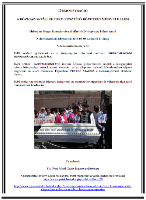 A többi panaszos érpataki lakos a problémák részletes ismertetésével május 8-án, 13:00 órakor a nyíregyházi kormányhivatal előtt (Hősök tere 5.) készül előadni a sajtónak, hogy milyen lehetetlen helyzetbe kerültek az állam működésének leállása miatt. Érpatak polgármestere, dr. Orosz Mihály Zoltán - az ügyeiket intézni nem tudó lakosok panaszát mellékelve - petíciót fog átadni a kormányhivatal képviselője részére.