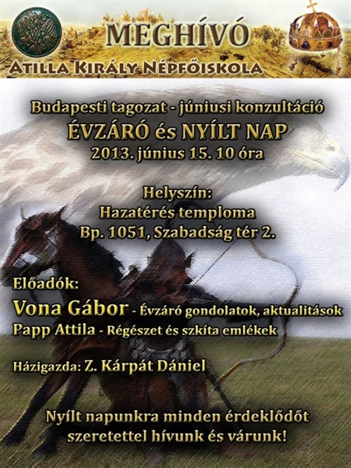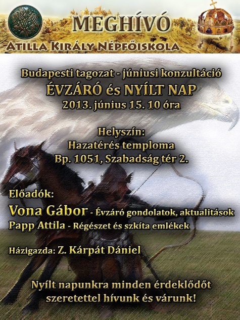 Az Atilla Király Népfőiskola 2012/2013-as tanév II. szemeszterének ötödik konzultációjára 2013. június 15-én 10 órától kerül sor, szokásos helyszínünkön, a Hazatérés templomában.