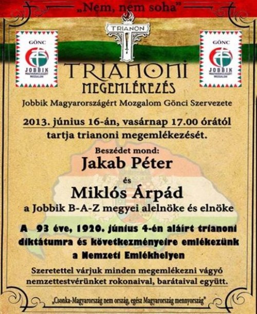 A gönci Jobbik most vasárnap tartja Trianon-megemlékezését