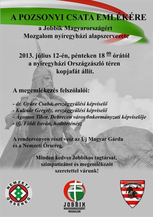 Kopjafaállítás Nyíregyházán a pozsonyi csata emlékére
