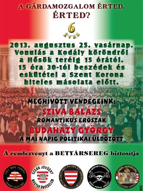 Augusztus 25-én, vasárnap ünnepeljük a Gárda megalakulásának 6 éves évfordulóját. Azt az eseményt, amikor 2007-ben a budai Várban 56 bátor magyar ember először tette le a gárdista esküt, ezzel felmutatva egy új, szervezett utat az ellenállásnak.