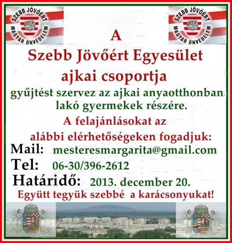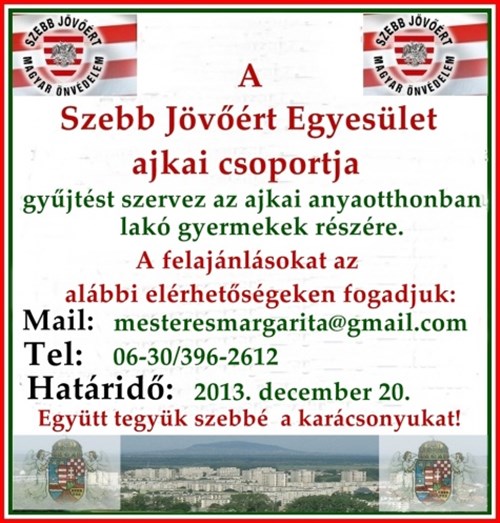 Gyűjtést szervez a Szebb Jövőért Önvédelem ajkai egysége az ajkai /Veszprém megye/ anyaotthon kis lakói számára. Elsősorban ruhákat, játékokat, édességet, könyveket, s egyéb olyan dolgot kérnek adományozóiktól, melyek örömet varázsolhatnak az otthon lakói számára karácsonykor.