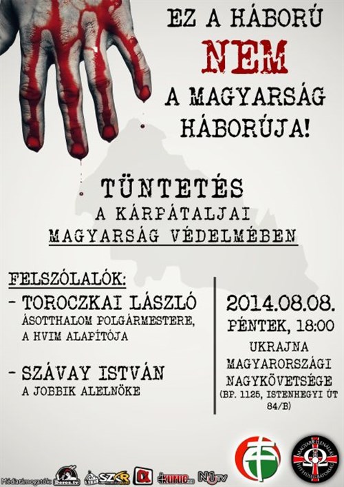 Ez a háború nem a magyarság háborúja - üzeni Szávay István, a Jobbik alelnöke és Toroczkai László, a HVIM tiszteletbeli elnöke a pénteki tüntetéssel, amelyet Ukrajna Magyarországi Nagykövetsége előtt tartanak 18 órától.