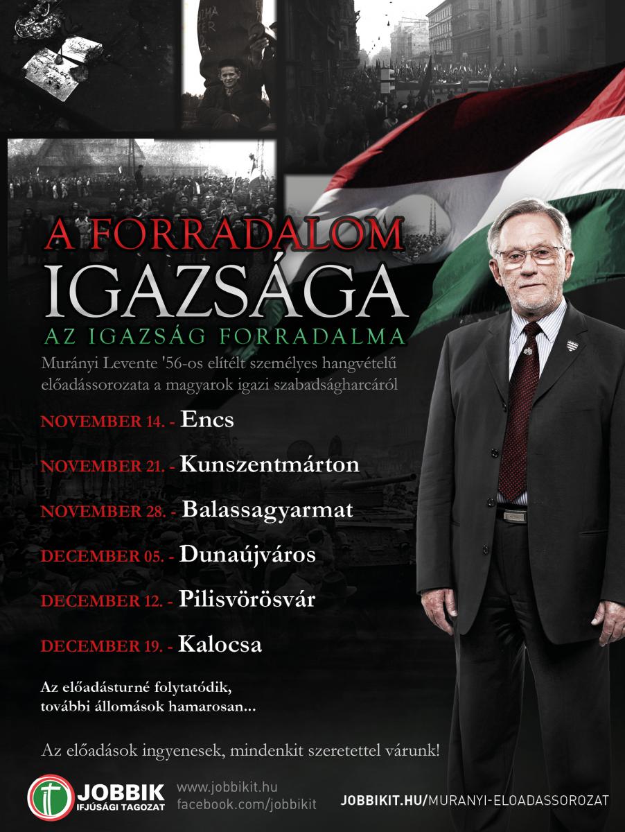 A Jobbik Ifjúsági Tagozat országjáró előadássorozatot szervez Murányi Levente, a Pesti Srácok '56-os Intézet igazgatója részvételével. A turnéval célunk, hogy az ország számos pontján bemutassuk a fiataloknak az 1956-os forradalom igazságát, mindezt egy olyan hiteles és példamutató ember segítségével, aki maga is fiatalon részt vett a harcokban.