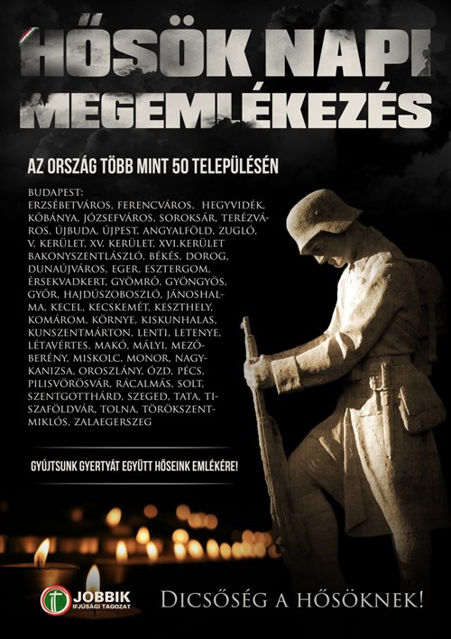 A Jobbik Ifjúsági Tagozatának kiemelten fontos, hogy hőseink hagyatékát megőrizzük és továbbadjuk az utókornak. Ők azok, akik a nehéz és ínséges időkben is a végsőkig kitartottak, s sokszor életüket is áldozták, hogy Magyarország jövője biztosítva legyen Európában és a Kárpát-medencében egyaránt. Nekünk, fiataloknak pedig kötelességünk, hogy a jó példából okuljunk, s ez a példa kötelez minket, hogy munkánkat a hétköznapokban is a megfelelő áldozatkészséggel, kitartással végezzük és sikeresen vegyük az elénk gördített akadályokat. Hazánkban ma is nagy szükség van a hősökre, s a mi felelősségünk, hogy beolvadunk e a multikulturalizmus számunkra idegen világába, vagy kellő alázattal belépünk a hősök sorába.