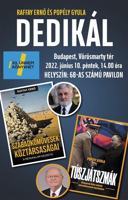 Raffay Ernő és Popély Gyula történészek új könyveiket dedikálják az Ünnepi Könyvhét budapesti rendezvényén. Mindketten előadói a Mi Hazánk Mozgalom által alapított Fekete István Szabadegyetemnek, Popély Gyula felvidéki történész professzor nemrég a Mi Hazánk Mozgalom államfőjelöltje volt.