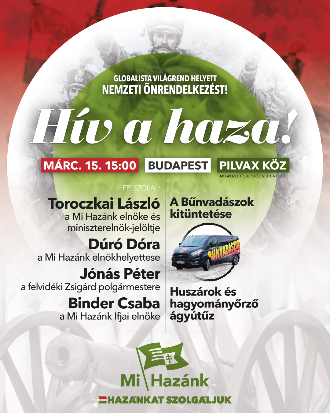 Globalista világrend helyett nemzeti önrendelkezést! mottóval tartja idei március 15-i gyűlését a Mi Hazánk Mozgalom – ezúttal is a Pilvax közben.