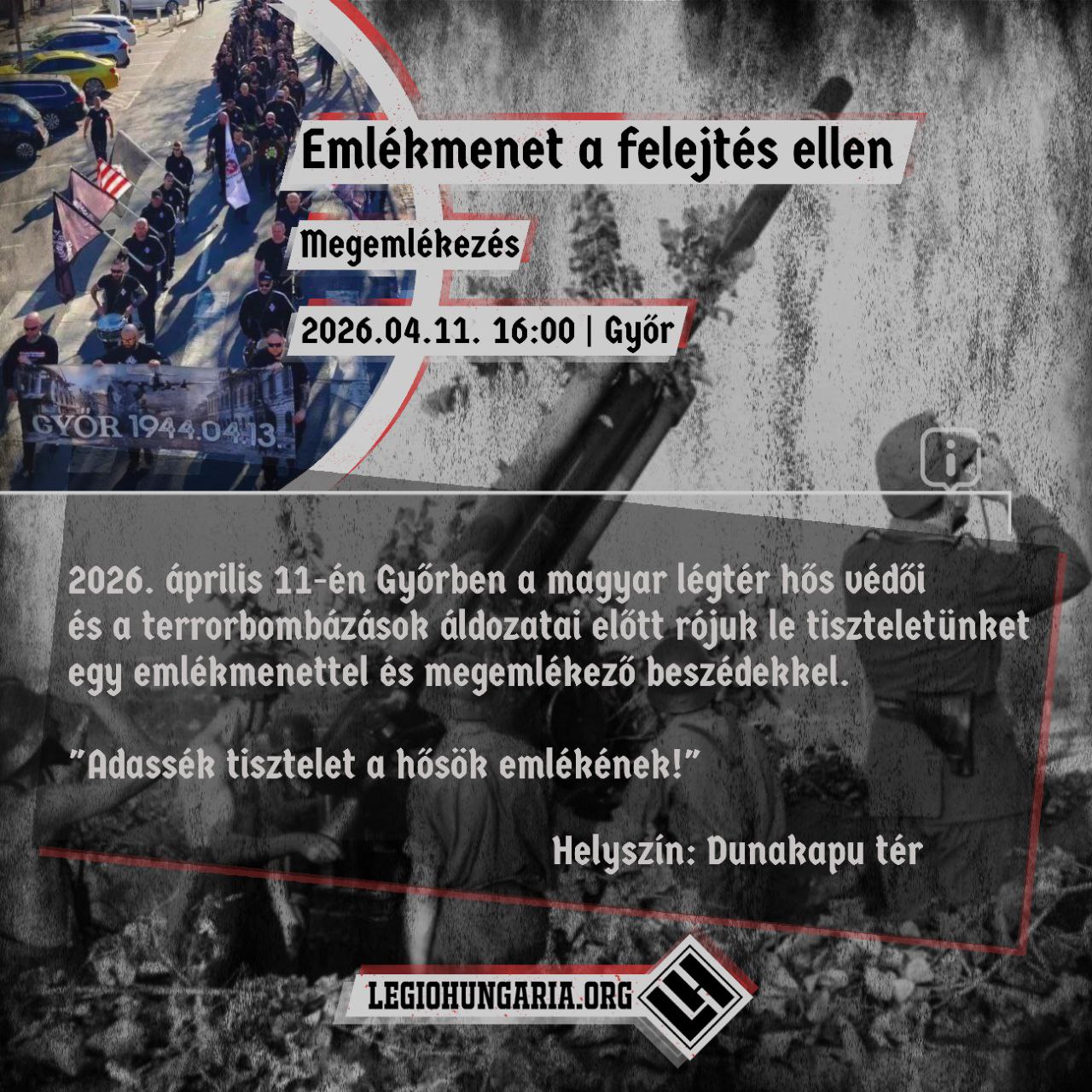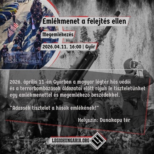 Április 11-én Győrben 16 órától várnak a szervezők mindenkit, akik szeretnék leróni tiszteletüket a magyar légtér hős védői, illetőleg a győri terrorbombázások áldozatai előtt.