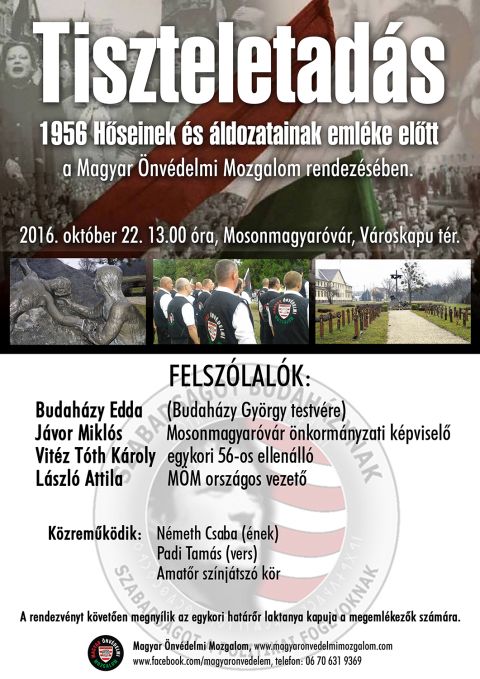 A Magyar Önvédelmi Mozgalom 2016. október 22-én, 1956 szellemében egy fegyelmezett és demonstratív kiállással fog adózni az egykori hőseink emléke előtt.